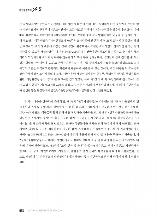 는 작성되었지만 종합적으로 정리된 적이 없었기 때문에 언제, 어느 지역에서 어떤 조사가 이루어져 있 는지 알아보려면 환경부디지털도서관에서 모든 자료를 검색해야 하는 불편함을 감수해야만 했다. 이에 따라 환경부에서 1986년부터 2015년까지 30년간 수행한 주요 조사사업에 대한 내용을 총 정리한 자료 의 필요성이 대두되었다. “자연환경조사 30년”은 조사사업에 관련된 기관, 조직 또는 사람 중심의 작성 을 지양하고, 조사의 내용에 초점을 맞춰 국민이 환경부에서 수행한 조사사업의 전체적인 윤곽을 쉽게 파악할 수 있도록 작성되었다. 이 책은 19862015년까지 전국자연환경조사를 기획하고 추진해온 국가 기관의 담당자들과 조사에 참여해온 전문가의 노고에 따른 성과물로써, 국민들이 쉽게 접근할 수 있는 있는 형태로...