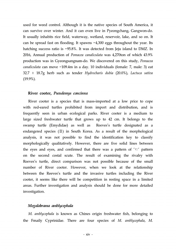 xiv used for weed control. Although it is the native species of South America, it can survive over winter. And it can even live in Pyeongchang, Gangwon-do. It usually inhabits rice field, waterway, wetland, reservoir, lake, and so on. It can be spread fast on flooding. It spawns 4,300 eggs throughout the year. Its hatching success ratio is 95.8%. It was detected from Jeju island to DMZ. In 2016, A...
