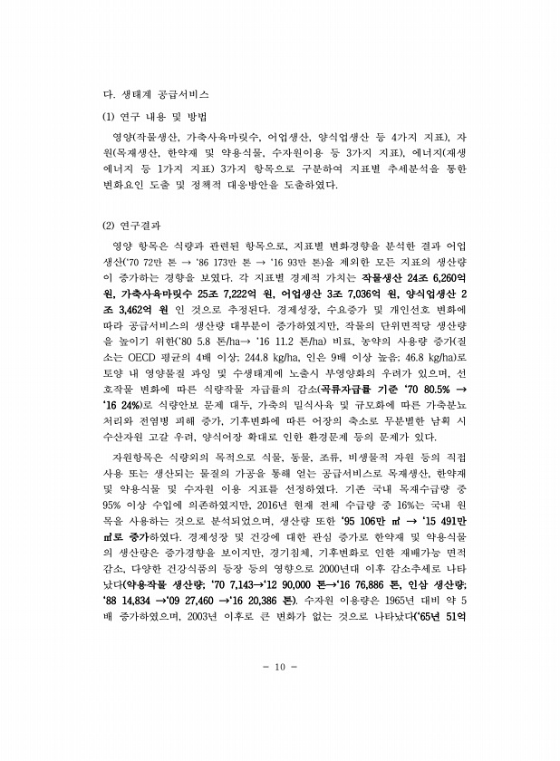 10 다. 생태계 공급서비스 1 연구 내용 및 방법 영양 작물생산, 가축사육마릿수, 어업생산, 양식업생산 등 4가지 지표 , 자 원 목재생산, 한약재 및 약용식물, 수자원이용 등 3가지 지표 , 에너지 재생 에너지 등 1가지 지표 3가지 항목으로 구분하여 지표별 추세분석을 통한 변화요인 도출 및 정책적 대응방안을 도출하였다. 2 연구결과 영양 항목은 식량과 관련된 항목으로, 지표별 변화경향을 분석한 결과 어업 생산 `70 72만 톤 → `86 173만 톤 → `16 93만 톤 을 제외한 모든 지표의 생산량 이 증가하는 경향을 보였다. 각 지표별 경제적 가치는 작물생산 24조 6,260억 원, 가축사육마릿수 25조 7,222억 원, 어업생산 3조 7,036억 원, 양식업생산 2 조 3,462억 원 인 것으로 ...