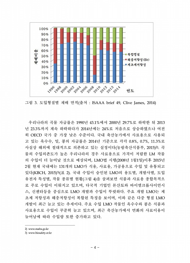 그림 3. 도입형질별 재배 면적 출처 ISAAA brief 49, Clive James, 2014 우리나라의 곡물 자급률은 1990년 43.1%에서 2000년 29.7%로 하락한 뒤 2013 년 23.3%까지 계속 하락하다가 2014년에는 24%로 처음으로 상승하였으나 여전 히 OECD 국가 중 가장 낮은 수준이다. 국내 축산농가에서 사료용으로 사용되 고 있는 옥수수, 밀, 콩의 자급률은 2014년 기준으로 각각 0.8%, 0.7%, 11.3%로 사실상 해외에 절대적으로 의존하고 있는 실정이다 농림축산식품부, 2015 2 곡 물의 수입의존도가 높은 우리나라의 경우 사료용으로 가격이 저렴한 LM 작물 의 수입이 더 늘어날 것으로 예상되며, LMO법 시행 2008년 1월1일 이후 2015년 2월 현재 국내에는 ...