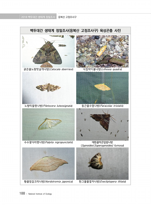 2018 백두대간 생태계 정밀조사 응복산 고정조사구 188 ? National Institute of Ecology 백두대간 생태계 정밀조사 응복산 고정조사구 육상곤충 사진 굵은줄노랑뒷날개나방 Catocala doerriesi 넉점박이불나방 Lithosia quadra 노랑띠들명나방 Piletocera luteosignata 둥근줄수염나방 Paracolax tristalis 수수꽃다리명나방 Palpita nigropunctalis 애흰줄썩은잎밤나방 Sypnoides Supersypnoides fumosa 황줄점갈고리나방 Nordstromia japonica 흰그물물결자나방 Evecliptopera illitata