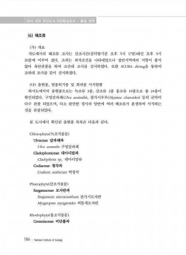 2015 전국 무인도서 자연환경조사 통영 권역 186 ? National Institute of Ecology 6 해조류 가 개요 저도에서의 해조류 조사는 간조시간 삼덕항기준 오후 5시 17분 대인 오후 5시 20분에 이루어 졌다. 조위는 최저조선을 나타내었으나 접안지역에의 지형이 좋지 않아 육안관찰을 하여 조간대 조사를 실시하였다. 또한 SCUBA diving을 통하여 조하대 조사를 같이 실시하였다. 나 출현종, 멸종위기종 및 희귀종 서식현황 하서도에서의 출현종으로는 녹조류 3종, 갈조류 2종 홍조류 19종으로 총 24종이 확인되었다. 구멍갈파래 Ulva australis , 참가시우무 Hypnea charoides 등의 군락이 다수 관찰 되었으며, 다소 완만한 경사의 암반에 여러 해조류가 혼생하여 서식하...