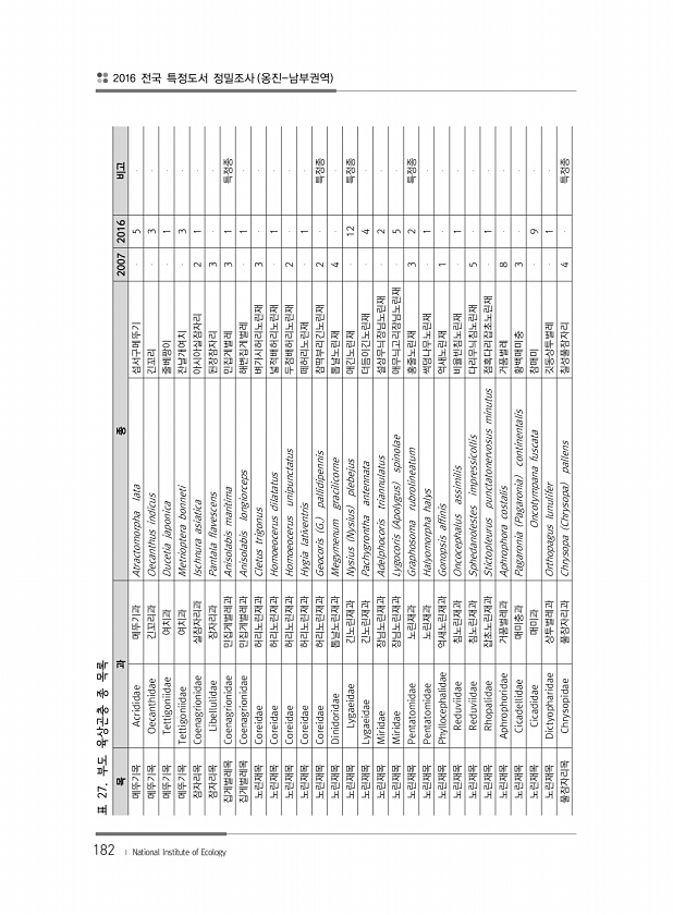 182 목 과 종 2007 2016 비고 메뚜기목 Acrididae 메뚜기과 Atractomorpha lata 섬서구메뚜기 5 메뚜기목 Oecanthidae 긴꼬리과 Oecanthus indicus 긴꼬리 3 메뚜기목 Tettigoniidae 여치과 Ducetia japonica 줄베짱이 1 메뚜기목 Tettigoniidae 여치과 Metrioptera bonneti 잔날개여치 3 잠자리목 Coenagrionidae 실잠자리과 Ischnura asiatica 아시아실잠자리 2 1 잠자리목 Libellulidae 잠자리과 Pantala flavescens 된장잠자리 3 집게벌레목 Coenagrionidae 민집게벌레과 Anisolabis maritima 민집게벌레 3 1...
