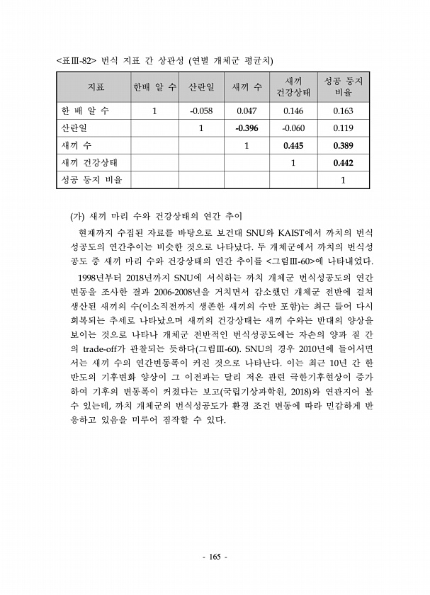 165 지표 한배 알 수 산란일 새끼 수 새끼 건강상태 성공 둥지 비율 한 배 알 수 1 -0.058 0.047 0.146 0.163 산란일 1 -0.396 -0.060 0.119 새끼 수 1 0.445 0.389 새끼 건강상태 1 0.442 성공 둥지 비율 1 표Ⅲ-82 번식 지표 간 상관성 연별 개체군 평균치 가 새끼 마리 수와 건강상태의 연간 추이 현재까지 수집된 자료를 바탕으로 보건대 SNU와 KAIST에서 까치의 번식 성공도의 연간추이는 비슷한 것으로 나타났다. 두 개체군에서 까치의 번식성 공도 중 새끼 마리 수와 건강상태의 연간 추이를 그림Ⅲ-60 에 나타내었다. 1998년부터 2018년까지 SNU에 서식하는 까치 개체군 번식성공도의 연간 변동을 조사한 결과 2006-2008년을 거치면서 감소했던...