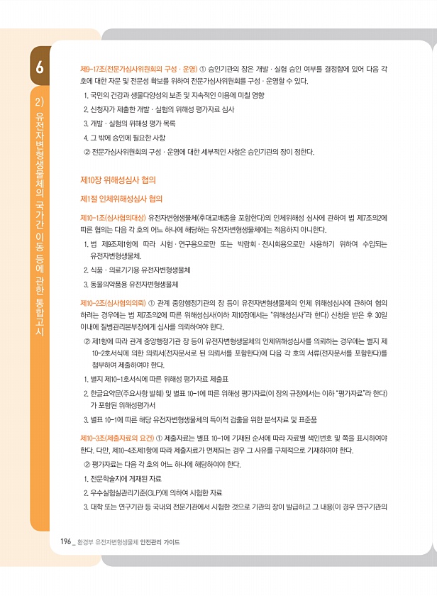 196 _ 환경부 유전자변형생물체 안전관리 가이드 6 유전자변형생물체의 국가간 이동 등에 관한 통합고시 2 제9-17조 전문가심사위원회의 구성·운영 ① 승인기관의 장은 개발·실험 승인 여부를 결정함에 있어 다음 각 호에 대한 자문 및 전문성 확보를 위하여 전문가심사위원회를 구성·운영할 수 있다. 1. 국민의 건강과 생물다양성의 보존 및 지속적인 이용에 미칠 영향 2. 신청자가 제출한 개발·실험의 위해성 평가자료 심사 3. 개발·실험의 위해성 평가 목록 4. 그 밖에 승인에 필요한 사항 ② 전문가심사위원회의 구성·운영에 대한 세부적인 사항은 승인기관의 장이 정한다. 제10장 위해성심사 협의 제1절 인체위해성심사 협의 제10-1조 심사협의대상 유전자변형생물체 후대교배종을 포함한다 의 인체위해성 심사에 관하여 법...