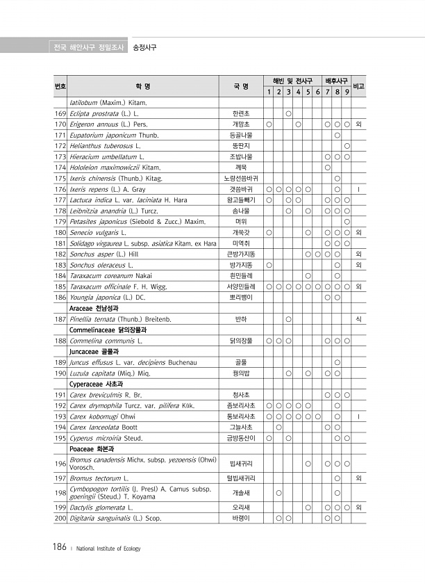 전국 해안사구 정밀조사 송정사구 186 ? National Institute of Ecology 번호 학 명 국 명 해빈 및 전사구 배후사구 비고 1 2 3 4 5 6 7 8 9 latilobum Maxim. Kitam. 169 Eclipta prostrata L. L. 한련초 ○ 170 Erigeron annuus L. Pers. 개망초 ○ ○ ○ ○ ○ 외 171 Eupatorium japonicum Thunb. 등골나물 ○ 172 Helianthus tuberosus L. 뚱딴지 ○ 173 Hieracium umbellatum L. 조밥나물 ○ ○ ○ 174 Hololeion maximowiczii Kitam. 께묵 ○ 175 Ixeris chinensis Thunb. Kitag. 노랑선씀바귀 ○ 17...