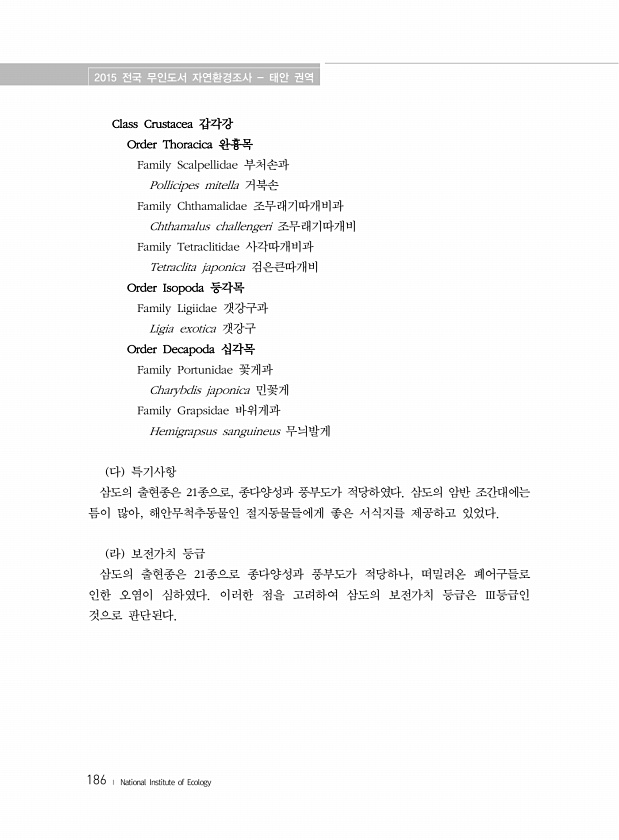 2015 전국 무인도서 자연환경조사 태안 권역 186 ? National Institute of Ecology Class Crustacea 갑각강 Order Thoracica 완흉목 Family Scalpellidae 부처손과 Pollicipes mitella 거북손 Family Chthamalidae 조무래기따개비과 Chthamalus challengeri 조무래기따개비 Family Tetraclitidae 사각따개비과 Tetraclita japonica 검은큰따개비 Order Isopoda 등각목 Family Ligiidae 갯강구과 Ligia exotica 갯강구 Order Decapoda 십각목 Family Portunidae 꽃게과 Charybdis japonica 민꽃게 Family Grapsid...