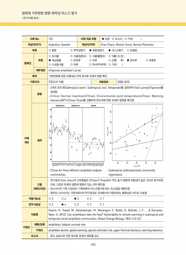 192 생태계 기후변화 영향·취약성·리스크 평가 -연구사례 분석- 사례 No. 153 사례 자료 유형 ■ 논문 □ 보고서 □ 기타 대상지 국가 Argentina, Sweden 대상지 지역 Gran Chaco, Atlantic forest, Iberian Peninsula 부문 □ 통합 □ 취약성평가 ■ 영향성평가 ■ 리스크평가 □ 모델링 분류군 부문 □ 상식물 □ 식물 침엽수 □ 식물 활엽수 □ 식물 초 본 ■ 육상동물 □ 포유류 □ 조류 □ 곤충 류 ■ 양서류 □ 파충류 □ 수상동식물 □ 어류 □ 저서무척추류 □ 기타 세부정보 47species amphibian Larval 목적 기후변화에 따른 아열대성 지역 양서류 유생의 영향 확인 기후인자 T 온도대 구별 자료정보 2008-2010 사례 개요 방법 3개...