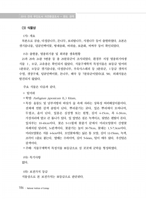 2015 전국 무인도서 자연환경조사 완도 권역 186 ? National Institute of Ecology 3 식물상 가 개요 목본으로 곰솔, 다정큼나무, 돈나무, 보리밥나무, 사철나무 등이 출현하였다. 초본은 갯기름나물, 덩굴민백미꽃, 땅채송화, 바위솔, 보춘화, 비짜루 등이 확인되었다. 나 출현종, 멸종위기종 및 희귀종 생육현황 21과 29속 24종 5변종 등 총 29분류군이 조사되었다. 환경부 지정 멸종위기야생 식물 Ⅰ, Ⅱ급, 고유종은 확인되지 않았다. 식물구계학적 특정식물은 Ⅲ등급 털머위 1분류군, Ⅱ등급 갯기름나물, 다정큼나무, 우묵사스레피 등 3분류군, Ⅰ등급 갯까치 수염, 갯장구채, 덩굴민백미꽃, 돈나무, 해국 등 7분류군이었다 표 58 외래식물은 발견되지 않았다. 주요 식물은 다음과 같다...