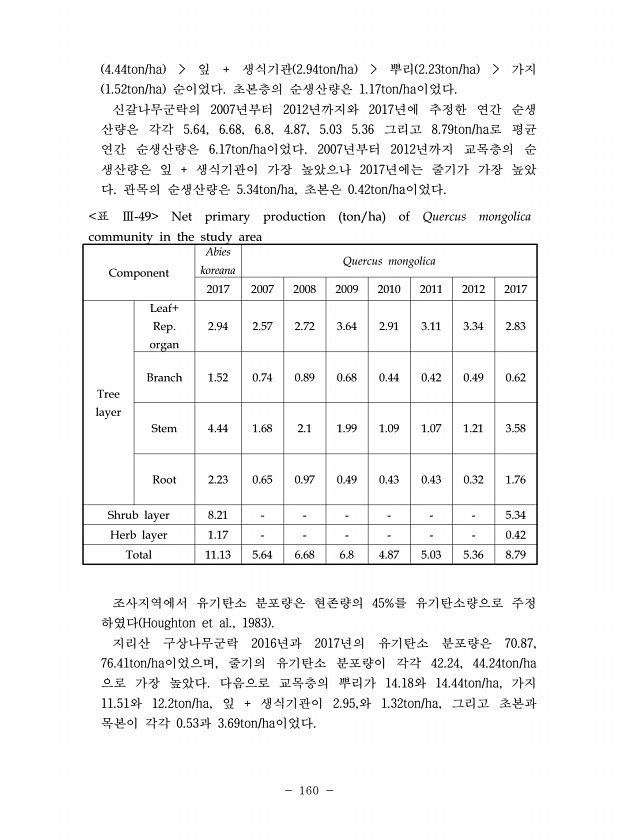 160 4.44ton/ha 잎 + 생식기관 2.94ton/ha 뿌리 2.23ton/ha 가지 1.52ton/ha 순이었다. 초본층의 순생산량은 1.17ton/ha이었다. 신갈나무군락의 2007년부터 2012년까지와 2017년에 추정한 연간 순생 산량은 각각 5.64, 6.68, 6.8, 4.87, 5.03 5.36 그리고 8.79ton/ha로 평균 연간 순생산량은 6.17ton/ha이었다. 2007년부터 2012년까지 교목층의 순 생산량은 잎 + 생식기관이 가장 높았으나 2017년에는 줄기가 가장 높았 다. 관목의 순생산량은 5.34ton/ha, 초본은 0.42ton/ha이었다. 표 Ⅲ-49 Net primary production ton/ha of Quercus mongolica community in t...