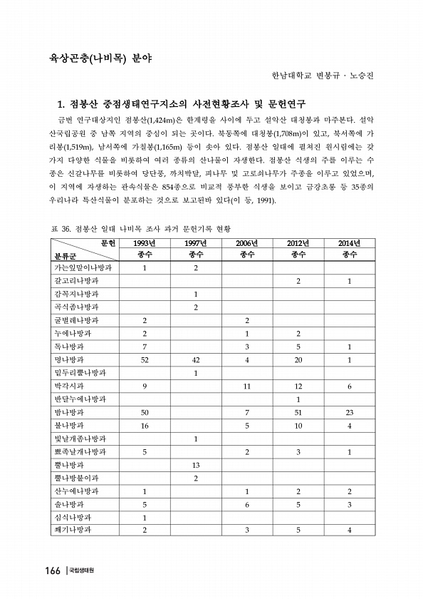 문헌 분류군 년 년 년 년 년 종수 종수 종수 종수 종수 가는잎말이나방과 갈고리나방과 감꼭지나방과 곡식좀나방과 굴벌레나방과 누에나방과 독나방과 명나방과 밑두리뿔나방과 박각시과 반달누에나방과 밤나방과 불나방과 빛날개좀나방과 뾰족날개나방과 뿔나방과 뿔나방붙이과 산누에나방과 솔나방과 심식나방과 쐐기나방과 표 36. 점봉산 일대 나비목 조사 과거 문헌기록 현황 육상곤충 나비목 분야 한남대학교 변봉규 ? 노승진 점봉산 중점생태연구지소의 사전현황조사 및 문헌연구 금번 연구대상지인 점봉산 은 한계령을 사이에 두고 설악산 대청봉과 마주본다 설악 산국립공원 중 남쪽 지역의 중심이 되는 곳이다 북동쪽에 대청봉 이 있고 북서쪽에 가 리봉 남서쪽에 가칠봉 등이 솟아 있다 점봉산 일대에 펼쳐진 원시림에는 갖 가지 다양한 식물을 비...