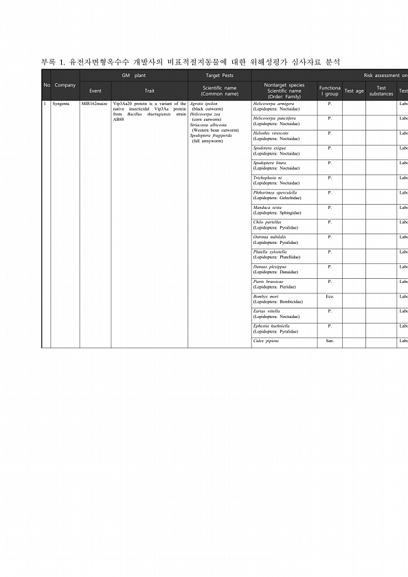 No. Company GM plant Target Pests Risk assessment on Event Trait Scientific name Common name Nontarget species Scientific name OrderFamily Functiona l group Test age substances Test Test 1 Syngenta MIR162maize Vip3Aa20 protein is a variant of the native insecticidal Vip3Aa protein from Bacillus thuringiensis strain AB88 Agrotis ipsilon black cutworm Helicoverpa zea corn earworm Striacosta albicost...