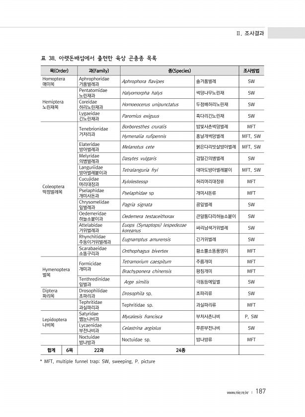 Ⅱ. 조사결과 www.nie.re.kr ? 187 목 Order 과 Family 종 Species 조사방법 Homoptera 매미목 Aphrophoridae 거품벌레과 Aphrophora flavipes 솔거품벌레 SW Hemiptera 노린재목 Pentatomidae 노린재과 Halyomorpha halys 썩덩나무노린재 SW Coreidae 허리노린재과 Homoeocerus unipunctatus 두점배허리노린재 SW Lygaeidae 긴노린재과 Paromius exiguus 흑다리긴노린재 SW Coleoptera 딱정벌레목 Tenebrionidae 거저리과 Borboresthes cruralis 밤빛사촌썩덩벌레 MFT Hymenalia rufipennis 홍날개썩덩벌레 MFT, SW Elateridae...