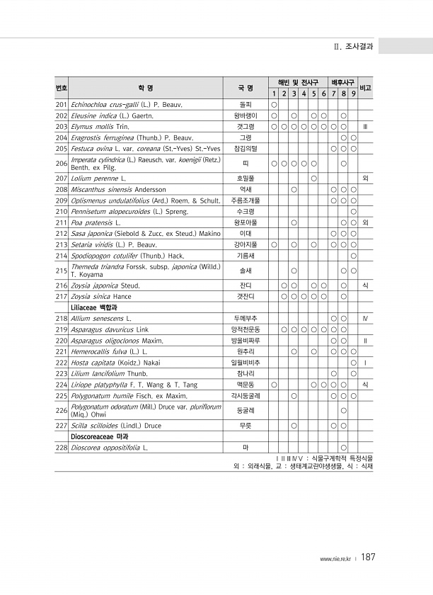 Ⅱ. 조사결과 www.nie.re.kr ? 187 번호 학 명 국 명 해빈 및 전사구 배후사구 비고 1 2 3 4 5 6 7 8 9 201 Echinochloa crus-galli L. P. Beauv. 돌피 ○ 202 Eleusine indica L. Gaertn. 왕바랭이 ○ ○ ○ ○ ○ 203 Elymus mollis Trin. 갯그령 ○ ○ ○ ○ ○ ○ ○ ○ Ⅲ 204 Eragrostis ferruginea Thunb. P. Beauv. 그령 ○ ○ 205 Festuca ovina L. var. coreana St.-Yves St.-Yves 참김의털 ○ ○ ○ 206 Imperata cylindrica L. Raeusch. var. koenigii Retz. Benth. ex Pilg. 띠 ○ ...