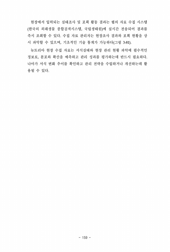 현장에서 입력되는 실태조사 및 포획 활동 결과는 웹의 자료 수집 시스템 한국의 외래생물 종합검색시스템, 국립생태원 에 실시간 전송되어 결과를 즉시 조회할 수 있다. 수집 자료 관리자는 현장조사 결과와 포획 현황을 상 시 파악할 수 있으며, 기초적인 기술 통계가 가능하다 그림 3-81 뉴트리아 현장 수집 자료는 서식실태와 현장 관리 현황 파악에 필수적인 정보로, 분포와 확산을 예측하고 관리 성과를 평가하는데 반드시 필요하다. 나아가 서식 변화 추이를 확인하고 관리 전략을 수립하거나 개선하는데 활 용될 수있다.