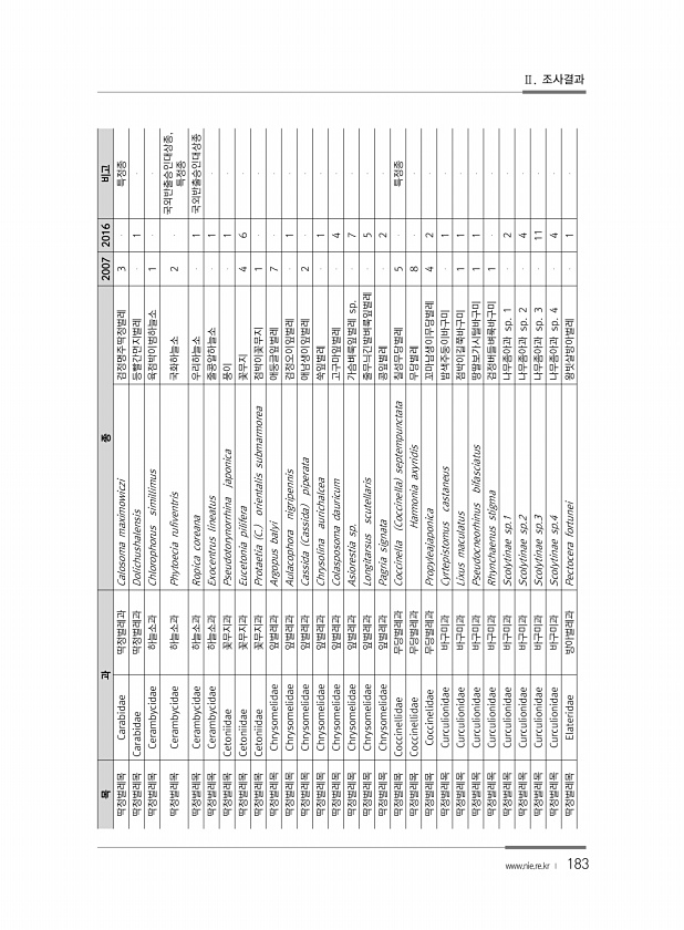 183 목 과 종 2007 2016 비고 딱정벌레목 Carabidae 딱정벌레과 Calosoma maximowiczi 검정명주딱정벌레 3 특정종 딱정벌레목 Carabidae 딱정벌레과 Dolichushalensis 등빨간먼지벌레 1 딱정벌레목 Cerambycidae 하늘소과 Chlorophorus simillimus 육점박이범하늘소 1 딱정벌레목 Cerambycidae 하늘소과 Phytoecia rufiventris 국화하늘소 2 국외반출승인대상종, 특정종 딱정벌레목 Cerambycidae 하늘소과 Ropica coreana 우리하늘소 1 국외반출승인대상종 딱정벌레목 Cerambycidae 하늘소과 Exocentrus lineatus 줄콩알하늘소 1 딱정벌레목 Cetoniid...