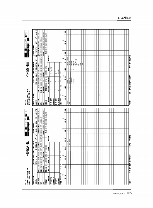 185 No 71 조사일자 2016년 9월 8일 조사자 김경순, 김동욱 식생조사표 군락명갯그령 조사지역강원도 강릉시 강동면 안인리 도엽명 구역번호 식생상관면적× ㎡ 위·경도 GPS 37° 44′ 42.91″N , 128° 58′ 46.31″E 해발2 m 지형□산정□능선□사면 □상□중□하 □계곡■평지 미세지형■평면 □돌출 □함몰□요철 방위토양□갈색삼림토 □적황색삼림토 □암적색삼림토 □회갈색삼림토 □침식토 □미숙토 □암쇄토 경사° 낙엽부식층cm 암석노출% 암석권□화성암□퇴적암□변성암 화강암 보전등급수분조건□과습 □약습 □중용 □약건 □과건 토성□사토 □양토 □식토 사질토 층위구분 높이 m 식피율 % 우점종 특기사항 교 목 층 T1 아교목층 T2 관 목 층 S 초 본 층 H 우점종 DBH 최대 cm , 중간 cm...