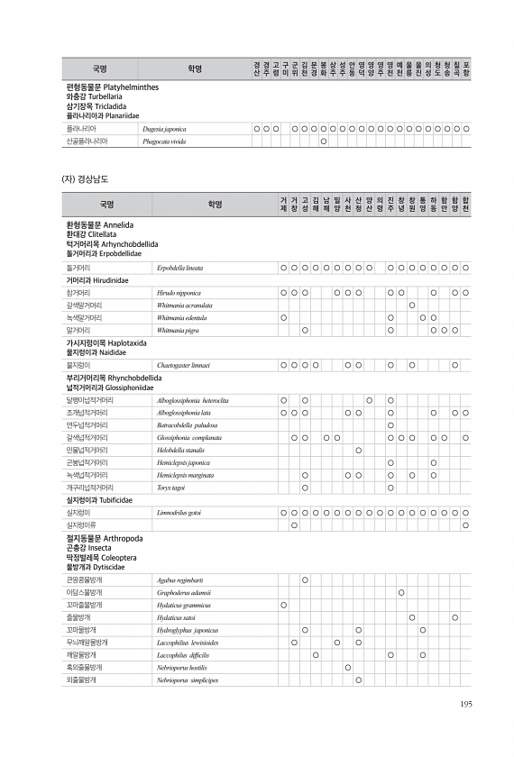 195 편형동물문 Platyhelminthes 와충강 Turbellaria 삼기장목 Tricladida 플라나리아과 Planariidae 플라나리아 Dugesia japonica ○ ○ ○ ○ ○ ○ ○ ○ ○ ○ ○ ○ ○ ○ ○ ○ ○ ○ ○ ○ ○ ○ 산골플라나리아 Phagocata vivida ○ 자 경상남도 국명 학명 거 제 거창 고성 김해 남해 밀양 사천 산청 양산 의령 진주 창녕 창원 통영 하동 함안 함양 합천 환형동물문 Annelida 환대강 Clitellata 턱거머리목 Arhynchobdellida 돌거머리과 Erpobdellidae 돌거머리 Erpobdella lineata ○ ○ ○ ○ ○ ○ ○ ○ ○ ○ ○ ○ ○ ○ ○ ○ ○ 거머리과 Hirudinidae 참거머리 Hirudo n...