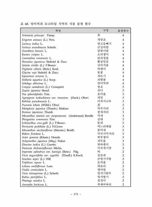 171 학명 국명 출현횟수 Artemisia princeps Pamp. 쑥 4 Erigeron annuus L. Pers. 개망초 4 Lactuca indica L. 왕고들빼기 4 Festuca arundinacea Schreb. 큰김의털 4 Oenothera biennis L. 달맞이꽃 4 Rumex crispus L. 소리쟁이 4 Commelina communis L. 닭의장풀 4 Humulus japonicus Sieboid & Zucc. 환삼덩굴 4 Setaria viridis L. P.Beauv. 강아지풀 4 Digitaria ciliaris Retz. Koel. 바랭이 4 Glycine soja Siebold & Zucc. 돌콩 4 Equisetum arvense L. 쇠뜨기 4 Stellaria...