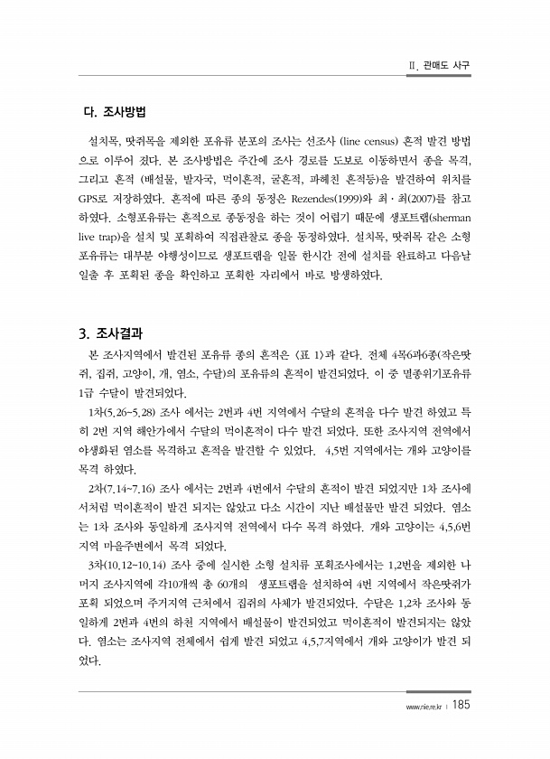 Ⅱ. 관매도 사구 www.nie.re.kr ? 185 다. 조사방법 설치목, 땃쥐목을 제외한 포유류 분포의 조사는 선조사 line census 흔적 발견 방법 으로 이루어 졌다. 본 조사방법은 주간에 조사 경로를 도보로 이동하면서 종을 목격, 그리고 흔적 배설물, 발자국, 먹이흔적, 굴흔적, 파헤친 흔적등 을 발견하여 위치를 GPS로 저장하였다. 흔적에 따른 종의 동정은 Rezendes 1999 와 최·최 2007 를 참고 하였다. 소형포유류는 흔적으로 종동정을 하는 것이 어렵기 때문에 생포트랩 sherman live trap 을 설치 및 포획하여 직접관찰로 종을 동정하였다. 설치목, 땃쥐목 같은 소형 포유류는 대부분 야행성이므로 생포트랩을 일몰 한시간 전에 설치를 완료하고 다음날 일출 후 포획된 종을 확인...