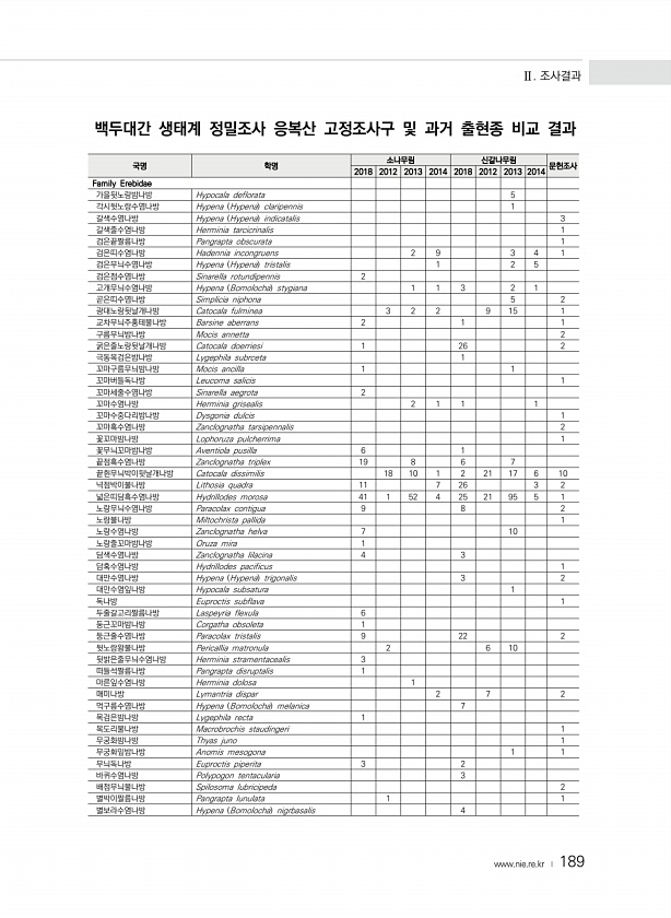 Ⅱ. 조사결과 www.nie.re.kr ? 189 국명 학명 소나무림 신갈나무림 문헌조사 2018 2012 2013 2014 2018 2012 2013 2014 Family Erebidae 가을뒷노랑밤나방 Hypocala deflorata 5 각시뒷노랑수염나방 Hypena Hypena claripennis 1 갈색수염나방 Hypena Hypena indicatalis 3 갈색줄수염나방 Herminia tarcicrinalis 1 검은끝짤름나방 Pangrapta obscurata 1 검은띠수염나방 Hadennia incongruens 2 9 3 4 1 검은무늬수염나방 Hypena Hypena tristalis 1 2 5 검은점수염나방 Sinarella rotundipennis 2 고개무늬수염나방 Hypena ...