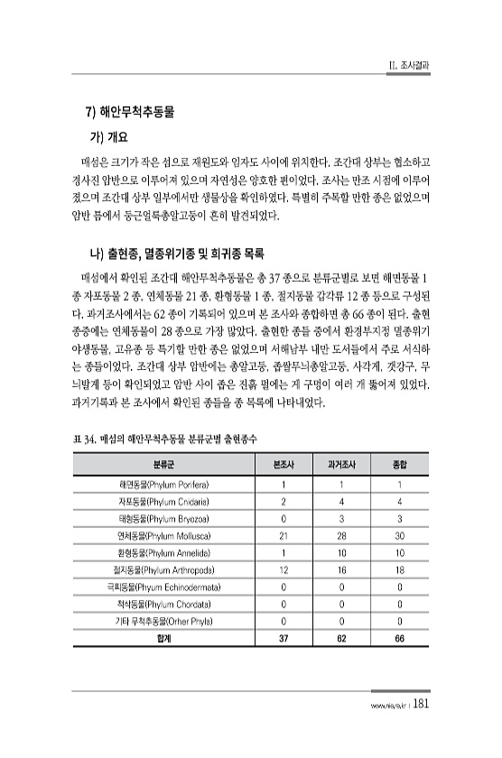 II. 조사결과 www.nie.re.kr ?181 7 매섬은 크기가 작은 섬으로 재원도와 임자도 사이에 위치한다. 조간대 상부는 협소하고 경사진 암반으로 이루어져 있으며 자연성은 양호한 편이었다. 조사는 만조 시점에 이루어 졌으며 조간대 상부 일부에서만 생물상을 확인하였다. 특별히 주목할 만한 종은 없었으며 암반 틈에서 둥근얼룩총알고둥이 흔히 발견되었다. , 매섬에서 확인된 조간대 해안무척추동물은 총 37 종으로 분류군별로 보면 해면동물 1 종 자포동물 2 종, 연체동물 21 종, 환형동물 1 종, 절지동물 갑각류 12 종 등으로 구성된 다. 과거조사에서는 62 종이 기록되어 있으며 본 조사와 종합하면 총 66 종이 된다. 출현 종중에는 연체동물이 28 종으로 가장 많았다. 출현한 종들 중에서 환경부지정 멸...