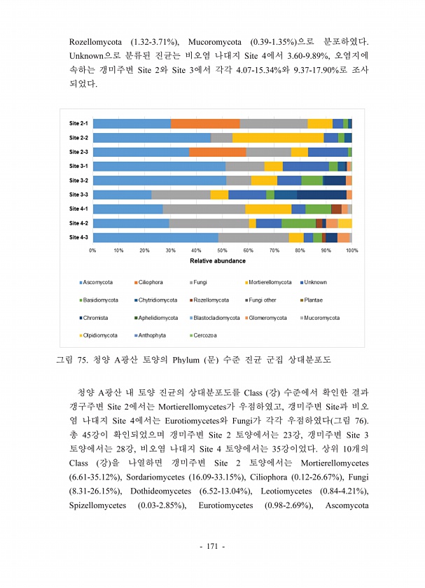 171 Rozellomycota 1.32-3.71% , Mucoromycota 0.39-1.35% Unknown Site 4 3.60-9.89%, Site 2 Site 3 4.07-15.34% 9.37-17.90% 75. A Phylum A Class Site 2 Mortierellomycetes , Site Site 4 Eurotiomycetes Fungi 76 45 Site 2 23 , Site 3 28 , Site 4 35 10 Class Site 2 Mortierellomycetes 6.61-35.12% , Sordariomycetes 16.09-33.15% , Ciliophora 0.12-26.67% , Fungi 8.31-26.15% , Dothideomycetes 6.52-13.04% , Leo...