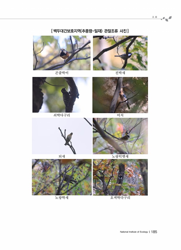 조 류 National Institute of EcologyⅠ185 [ 백두대간보호지역 추풍령밀재 관찰조류 사진 ] 곤줄박이 진박새 쇠딱다구리 어치 되새 노랑턱멧새 노랑딱새오색딱다구리