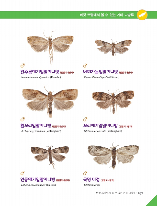 버킷 트랩에서 볼 수 있는 기타 나방류?197 버킷 트랩에서 볼 수 있는 기타 나방류 잔주름애기잎말이나방 잎말이나방과 Neoanathamna nipponica Kawabe 버찌가는잎말이나방 잎말이나방과 Eupoecilia ambiguella H?bner 인동애기잎말이나방 잎말이나방과 Lobesia coccophaga Falkovitsh 국명 미정 잎말이나방과 Olethreutes sp. 흰꼬리잎말이나방 잎말이나방과 Archips nigricaudana Walsingham 꼬리애기잎말이나방 잎말이나방과 Olethreutes obovate Walsingham