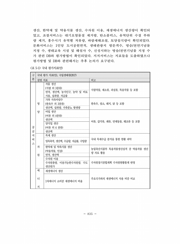 835 구 분 국내 평가 지표 안 , 국립생태원 2017 설명 지표 비고 공 급 서 비 스 영 양 작물 생산 식량 외 3종류 식량작물, 채소류, 과실류, 특용작물 등 포함 면적, 생산액, 농가인구, 농약 및 비료 사용, 섭취량, 자급률 가축 사육마릿수 한육우 외 3종류 한육우, 젖소, 돼지, 닭 등 포함 생산액, 섭취량, 가축분뇨 발생량 어업 생산 어류 외 4종류 생산액 어류, 갑각류, 패류, 연체동물, 해조류 등 포함 양식업 생산 어류 외 4 종류 생산액 자 원 목재 생산 국내 목재수급 분석을 통한 현황 파악 임목축적, 생산액, 수급량, 자급률, 수입량 한약재 및 약욕식물 생산 약용작물, 인삼 농림축산식품부 특용작물생산실적 중 약용작물 생산 량 자료 활용 면적, 생산액 수자원 이용 수자원총량, 이용가능한수...