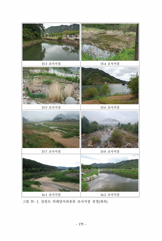 Ⅱ. 조사결과 www.nie.re.kr ? 187 구분 배후산지구간 st5-8 조사지역 현황사진 현황 소나무림이 있는 장소로 인위적인 시설로 산책로와 화장실, 주차장, 비포장로, 수로, 민가, 묘소 등이 위치한다. 사람들의 통행은 일부 구간에 한해 많은 편이며, 계절에 따라 집중될 것으로 추측된다. 송림보호구역, 산림정화구역이라는 팻말 들이 있으나 삼림욕장으로 이용되는 공간이 있고, 소로들도 많다. 소나무는 수령이 적은 나무로 구성되어 있으며, 초본류는 빈약하고 덩굴류 식물이 주로 도포되어 있다. 유효 수자원은 거의 없는 상태이며, 일부 인위적인 농수로가 확인되나 건천이다. 주요종 참개구리 표 24. 강원도 삼척시 근덕면 맹방해안사구의 조사지역 현황 계속