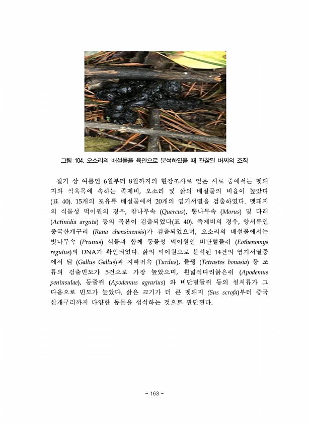 그림 104. 오소리의 배설물을 육안으로 분석하였을 때 관찰된 버찌의 조직 절기 상 여름인 6월부터 8월까지의 현장조사로 얻은 시료 중에서는 멧돼 지와 식육목에 속하는 족제비, 오소리 및 삵의 배설물의 비율이 높았다 표 40 15개의 포유류 배설물에서 20개의 염기서열을 검출하였다. 멧돼지 의 식물성 먹이원의 경우, 참나무속 Quercus , 뽕나무속 Morus 및 다래 Actinidia arguta 등의 목본이 검출되었다 표 40 족제비의 경우, 양서류인 중국산개구리 Rana chensinensis 가 검출되었으며, 오소리의 배설물에서는 벚나무속 Prunus 식물과 함께 동물성 먹이원인 비단털들쥐 Eothenomys regulus 의 DNA가 확인되었다. 삵의 먹이원으로 분석된 14건의 염기서열중 에서 닭...