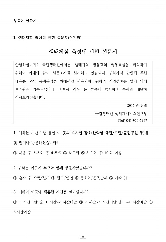 181 부록2. 설문지 1. 생태체험 측정에 관한 설문지 산악형 생태체험 측정에 관한 설문지 안녕하십니까? 국립생태원에서는 생태지역 방문객의 행동특성을 파악하기 위하여 아래와 같이 설문조사를 실시하고 있습니다. 귀하께서 답변해 주신 내용은 오직 통계분석을 위해서만 사용되며, 귀하의 개인정보는 법에 의해 보호됨을 약속드립니다. 바쁘시더라도 본 설문에 협조하여 주시면 대단히 감사드리겠습니다. 2017 년 6 월 국립생태원 생태계서비스연구부 Tel 041-950-5967 1. 귀하는 지난 1 년 동안 이 곳과 유사한 장소 산악형 국립/도립/군립공원 등 에 몇 번이나 방문하셨습니까? ① 처음 ② 23 회 ③ 45 회 ④ 67 회 ⑤ 89 회 ⑥ 10 회 이상 2. 귀하는 이곳에 누구와 함께 방문하셨습니까? ① 혼자...
