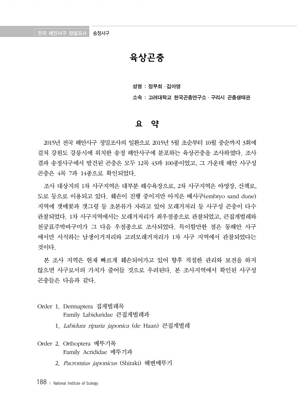 전국 해안사구 정밀조사 송정사구 188 ? National Institute of Ecology 육상곤충 성명 정부희·김아영 소속 고려대학교 한국곤충연구소·구리시 곤충생태관 요 약 2015년 전국 해안사구 정밀조사의 일환으로 2015년 5월 초순부터 10월 중순까지 3회에 걸쳐 강원도 강릉시에 위치한 송정 해안사구에 분포하는 육상곤충을 조사하였다. 조사 결과 송정사구에서 발견된 곤충은 모두 12목 43과 100종이었고, 그 가운데 해안 사구성 곤충은 4목 7과 14종으로 확인되었다. 조사 대상지의 1차 사구지역은 대부분 해수욕장으로, 2차 사구지역은 야영장, 산책로, 도로 등으로 이용되고 있다. 훼손이 진행 중이지만 아직은 배사구 embryo sand dune 지역에 갯메꽃과 갯그령 등 초본류가 자라고 있어...