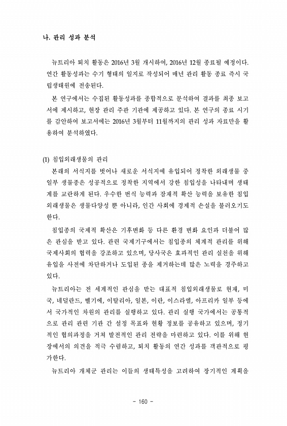 나. 관리 성과 분석 뉴트리아 퇴치 활동은 2016년 3월 개시하여, 2016년 12월 종료될 예정이다. 연간 활동성과는 수기 형태의 일지로 작성되어 매년 관리 활동 종료 즉시 국 립생태원에 전송된다. 본 연구에서는 수집된 활동성과를 종합적으로 분석하여 결과를 최종 보고 서에 제시하고, 현장 관리 주관 기관에 제공하고 있다. 본 연구의 종료 시기 를 감안하여 보고서에는 2016년 3월부터 11월까지의 관리 성과 자료만을 활 용하여 분석하였다. 1 침입외래생물의 관리 본래의 서식지를 벗어나 새로운 서식지에 유입되어 정착한 외래생물 중 일부 생물종은 성공적으로 정착한 지역에서 강한 침입성을 나타내며 생태 계를 교란하게 된다. 우수한 번식 능력과 잠재적 확산 능력을 보유한 침입 외래생물은 생물다양성 뿐 아니라, ...