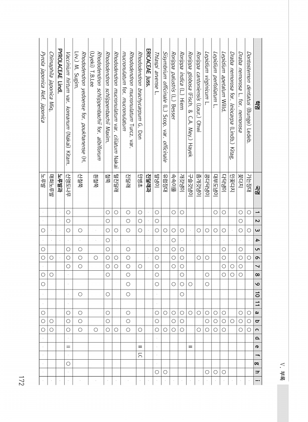 Ⅴ. 부록 172 학명 국명 1 2 3 4 5 6 7 8 9 10 11 a b c d e f g h i Dontostemon dentatus Bunge Ledeb. 가는장대 ○ ○ ○ ○ ○ ○ Draba nemorosa L. for. nemorosa 꽃다지 ○ ○ ○ ○ ○ ○ ○ ○ ○ ○ Draba nemorosa for. leiocarpa Lindb. Kitag. 민꽃다지 ○ ○ ○ Lepidium apetalum Willd. 다닥냉이 ○ ○ ○ ○ ○ ○ ○ ○ ○ ○ Lepidium perfoliatum L. 대부도냉이 ○ ○ ○ ○ ○ ○ Lepidium virginicum L. 콩다닥냉이 ○ ○ ○ ○ ○ ○ ○ ○ Rorippa cantoniensis Lour. Ohwi 좀개갓냉이 ○ ○ ○...
