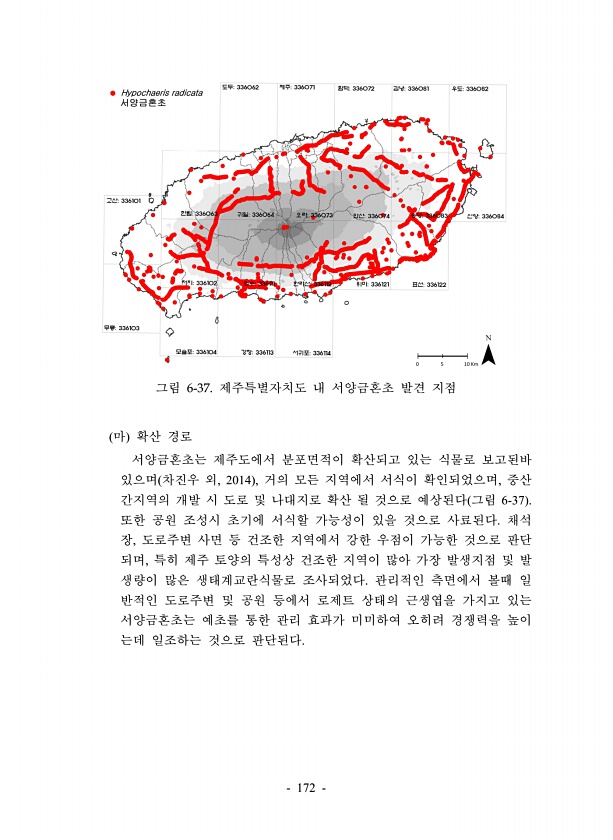 172 그림 6-37. 제주특별자치도 내 서양금혼초 발견 지점 마 확산 경로 서양금혼초는 제주도에서 분포면적이 확산되고 있는 식물로 보고된바 있으며 차진우 외, 2014 , 거의 모든 지역에서 서식이 확인되었으며, 중산 간지역의 개발 시 도로 및 나대지로 확산 될 것으로 예상된다 그림 6-37 또한 공원 조성시 초기에 서식할 가능성이 있을 것으로 사료된다. 채석 장, 도로주변 사면 등 건조한 지역에서 강한 우점이 가능한 것으로 판단 되며, 특히 제주 토양의 특성상 건조한 지역이 많아 가장 발생지점 및 발 생량이 많은 생태계교란식물로 조사되었다. 관리적인 측면에서 볼때 일 반적인 도로주변 및 공원 등에서 로제트 상태의 근생엽을 가지고 있는 서양금혼초는 예초를 통한 관리 효과가 미미하여 오히려 경쟁력을 높이 는...