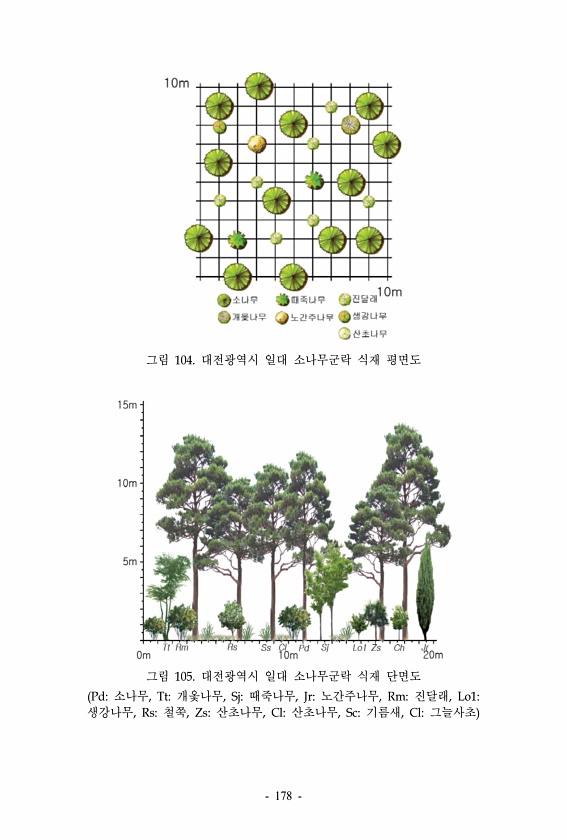 그림 104. 대전광역시 일대 소나무군락 식재 평면도 그림 105. 대전광역시 일대 소나무군락 식재 단면도 Pd소나무, Tt개옻나무, Sj때죽나무, Jr노간주나무, Rm진달래, Lo1생강나무, Rs철쭉, Zs산초나무, Cl산초나무, Sc기름새, Cl그늘사초 178