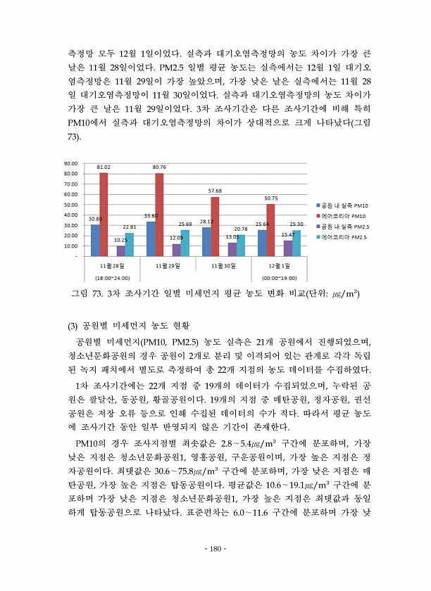 180 측정망 모두 월 일이었다 실측과 대기오염측정망의 농도 차이가 가장 큰 날은 월 일이었다 일별 평균 농도는 실측에서는 월 일 대기오 염측정망은 월 일이 가장 높았으며 가장 낮은 날은 실측에서는 월 일 대기오염측정망이 월 일이었다 실측과 대기오염측정망의 농도 차이가 가장 큰 날은 월 일이었다 차 조사기간은 다른 조사기간에 비해 특히 에서 실측과 대기오염측정망의 차이가 상대적으로 크게 나타났다 그림 그림 차 조사기간 일별 미세먼지 평균 농도 변화 비교 단위 공원별 미세먼지 농도 현황 공원별 미세먼지 농도 실측은 개 공원에서 진행되었으며 청소년문화공원의 경우 공원이 개로 분리 및 이격되어 있는 관계로 각각 독립 된 녹지 패치에서 별도로 측정하여 총 개 지점의 농도 데이터를 수집하였다 차 조사기간에는 개 지점...