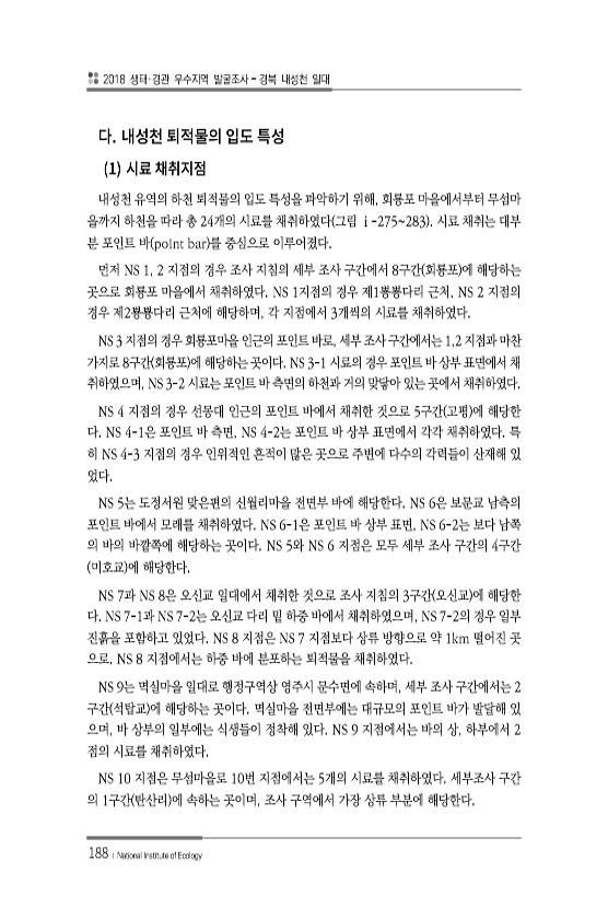 2018 생태·경관 우수지역 발굴조사 경북 내성천 일대 188 ? National Institute of Ecology 1 내성천 유역의 하천 퇴적물의 입도 특성을 파악하기 위해, 회룡포 마을에서부터 무섬마 을까지 하천을 따라 총 24개의 시료를 채취하였다 그림 ⅰ-275283 시료 채취는 대부 분 포인트 바 point bar 를 중심으로 이루어졌다. 먼저 NS 1, 2 지점의 경우 조사 지침의 세부 조사 구간에서 8구간 회룡포 에 해당하는 곳으로 회룡포 마을에서 채취하였다. NS 1지점의 경우 제1뿅뿅다리 근처, NS 2 지점의 경우 제2뿅뿅다리 근처에 해당하며, 각 지점에서 3개씩의 시료를 채취하였다. NS 3 지점의 경우 회룡포마을 인근의 포인트 바로, 세부 조사 구간에서는 1,2 지점과 마찬 가지로 ...