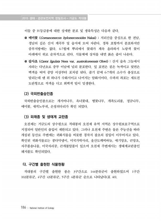 2015 생태·경관보전지역 정밀조사 거금도 적대봉 186 ? National Institute of Ecology 이들 중 IV등급종에 대한 상세한 분포 및 생육특성은 다음과 같다. @ 매미꽃 Coreanomecon hylomeconoides Nakai 지리산을 중심으로 한 전남, 경남의 깊은 산지 계곡부 및 습지에 모여 자란다. 경북 포항까지 분포하지만 중부지방에는 없다. 6-7월에 뿌리에서 꽃대가 계속 올라와서 노랑색 꽃이 아래에서 위로 순차적으로 핀다. 식물체에 상처를 내면 붉은 즙이 나온다. @ 갈사초 Carex ligulata Nees var. austrokoreensis Ohwi 산지 숲속 그늘에서 자라는 다년초로 중부 이남에 널리 분포한다. 잎 표면은 짙은 녹색이고 뒷면은 백색을 띠며 중앙 이상...