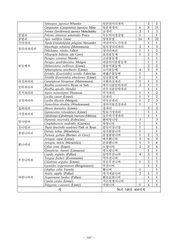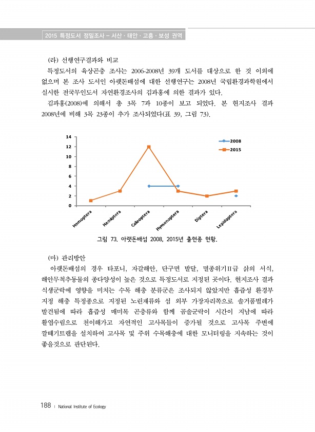 2015 특정도서 정밀조사 서산·태안·고흥·보성 권역 188 ? National Institute of Ecology 라 선행연구결과와 비교 특정도서의 육상곤충 조사는 2006-2008년 39개 도서를 대상으로 한 것 이외에 없으며 본 조사 도서인 아랫돈배섬에 대한 선행연구는 2008년 국립환경과학원에서 실시한 전국무인도서 자연환경조사의 김과홍에 의한 결과가 있다. 김과홍 2008 에 의해서 총 3목 7과 10종이 보고 되었다. 본 현지조사 결과 2008년에 비해 3목 23종이 추가 조사되었다 표 39, 그림 73 8 6 4 2 0 10 12 14 2008 2015 그림 73. 아랫돈배섬 2008, 2015년 출현종 현황. 마 관리방안 아랫돈배섬의 경우 타포니, 자갈해안, 단구면 발달, 멸종위기Ⅱ급 삵의 서...