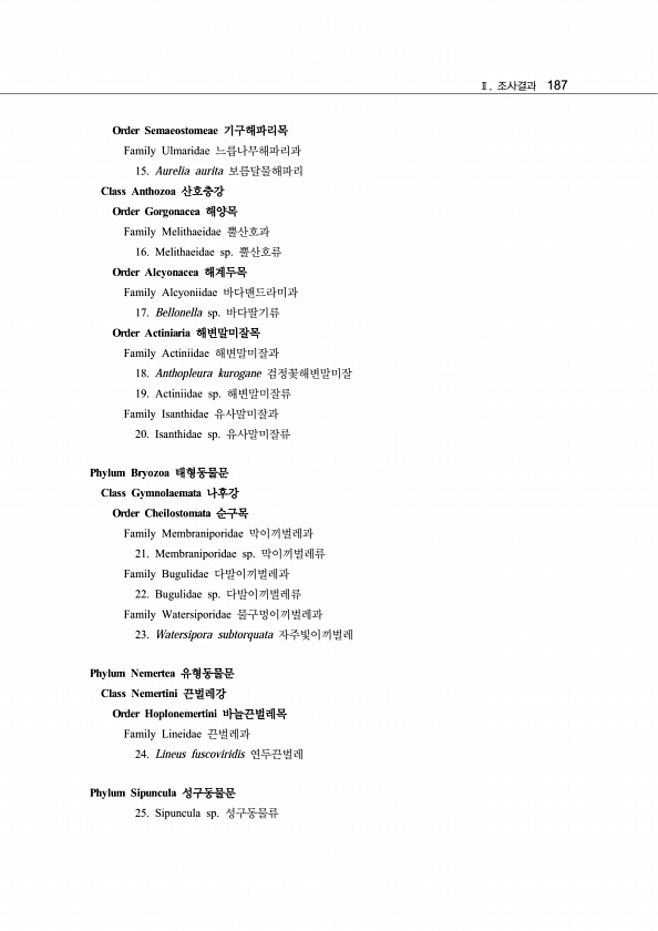 Ⅱ. 조사결과 187 Order Semaeostomeae 기구해파리목 Family Ulmaridae 느릅나무해파리과 15. Aurelia aurita 보름달물해파리 Class Anthozoa 산호충강 Order Gorgonacea 해양목 Family Melithaeidae 뿔산호과 16. Melithaeidae sp. 뿔산호류 Order Alcyonacea 해계두목 Family Alcyoniidae 바다맨드라미과 17. Bellonella sp. 바다딸기류 Order Actiniaria 해변말미잘목 Family Actiniidae 해변말미잘과 18. Anthopleura kurogane 검정꽃해변말미잘 19. Actiniidae sp. 해변말미잘류 Family Isanthidae 유사말미잘과 20. Isan...