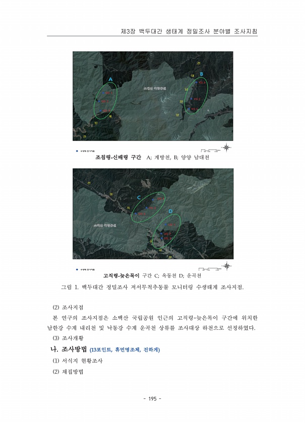 2015 DMZ 일원 생태계 조사 민통선이북지역 동부해안권역 188 ? National Institute of Ecology 조사 지역 조사경로명 조사경로 조사일 주요 조사내용 고성 지경천 코스 사천리 ? 외면리 ? 덕산리 명호리 ‘14.9.15 무인센서 카메라 설치 ‘15.7.22 무인센서 카메라 설치·점검 ‘15.9.16 무인센서 카메라 점검 ‘16.1.28 무인센서 카메라 회수 마달리 코스 마달리 ? 신대리 외면리 ‘14.9.16 무인센서 카메라 설치 ‘15.7.22 무인센서 카메라 설치·점검 ‘15.9.16 무인센서 카메라 점검 ‘16.1.28 무인센서 카메라 회수 명파리/부봉천 코스 명파리 ? 마달리 ? 유천동 용하리 ‘14.9.16 무인센서 카메라 설치 ‘15.7.22 무인센서 카메라 설치·점검 ...