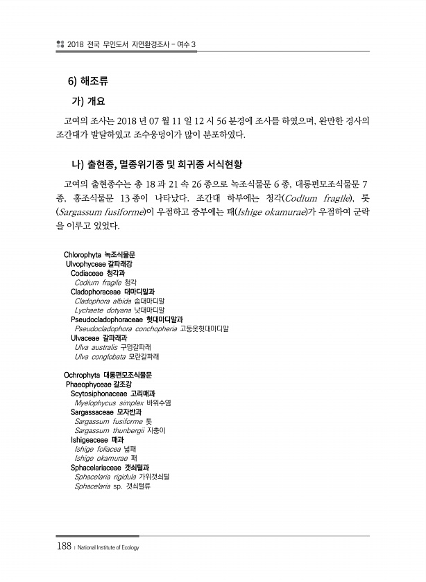 2018 전국 무인도서 자연환경조사 여수 3 188 ? National Institute of Ecology 6 고여의 조사는 2018 년 07 월 11 일 12 시 56 분경에 조사를 하였으며, 완만한 경사의 조간대가 발달하였고 조수웅덩이가 많이 분포하였다. , 고여의 출현종수는 총 18 과 21 속 26 종으로 녹조식물문 6 종, 대롱편모조식물문 7 종, 홍조식물문 13 종이 나타났다. 조간대 하부에는 청각 Codium fragile , 톳 Sargassum fusiforme 이 우점하고 중부에는 패 Ishige okamurae 가 우점하여 군락 을 이루고 있었다. Chlorophyta 녹조식물문 Ulvophyceae 갈파래강 Codiaceae 청각과 Codium fragile 청각 Cladophorac...