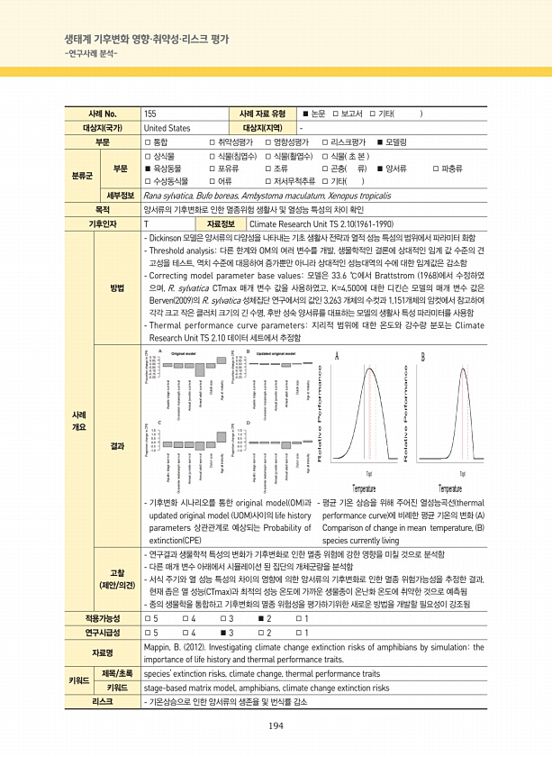 194 생태계 기후변화 영향·취약성·리스크 평가 -연구사례 분석- 사례 No. 155 사례 자료 유형 ■ 논문 □ 보고서 □ 기타 대상지 국가 United States 대상지 지역 부문 □ 통합 □ 취약성평가 □ 영향성평가 □ 리스크평가 ■ 모델링 분류군 부문 □ 상식물 □ 식물 침엽수 □ 식물 활엽수 □ 식물 초 본 ■ 육상동물 □ 포유류 □ 조류 □ 곤충 류 ■ 양서류 □ 파충류 □ 수상동식물 □ 어류 □ 저서무척추류 □ 기타 세부정보 Rana sylvatica, Bufo boreas, Ambystoma maculatum, Xenopus tropicalis 목적 양서류의 기후변화로 인한 멸종위험 생활사 및 열성능 특성의 차이 확인 기후인자 T 자료정보 Climate Research Unit TS 2.10...