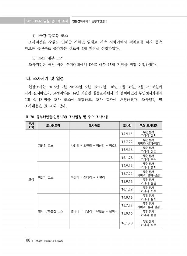 2015 DMZ 일원 생태계 조사 민통선이북지역 동부해안권역 188 ? National Institute of Ecology 조사 지역 조사경로명 조사경로 조사일 주요 조사내용 고성 지경천 코스 사천리 ? 외면리 ? 덕산리 명호리 ‘14.9.15 무인센서 카메라 설치 ‘15.7.22 무인센서 카메라 설치·점검 ‘15.9.16 무인센서 카메라 점검 ‘16.1.28 무인센서 카메라 회수 마달리 코스 마달리 ? 신대리 외면리 ‘14.9.16 무인센서 카메라 설치 ‘15.7.22 무인센서 카메라 설치·점검 ‘15.9.16 무인센서 카메라 점검 ‘16.1.28 무인센서 카메라 회수 명파리/부봉천 코스 명파리 ? 마달리 ? 유천동 용하리 ‘14.9.16 무인센서 카메라 설치 ‘15.7.22 무인센서 카메라 설치·점검 ...