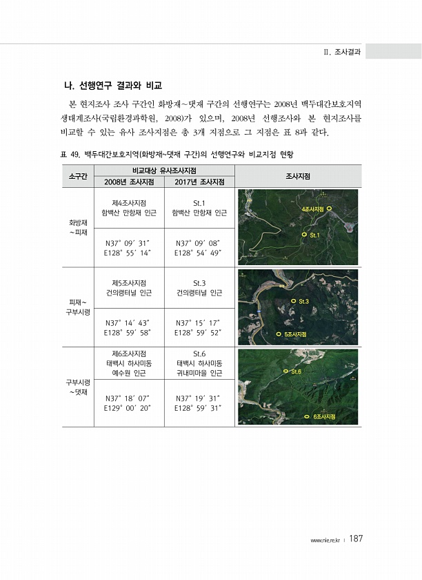 Ⅱ. 조사결과 www.nie.re.kr ? 187 나. 선행연구 결과와 비교 본 현지조사 조사 구간인 화방재∼댓재 구간의 선행연구는 2008년 백두대간보호지역 생태계조사 국립환경과학원, 2008 가 있으며, 2008년 선행조사와 본 현지조사를 비교할 수 있는 유사 조사지점은 총 3개 지점으로 그 지점은 표 8과 같다. 표 49. 백두대간보호지역 화방재댓재 구간 의 선행연구와 비교지점 현황 소구간 비교대상 유사조사지점 조사지점 2008년 조사지점 2017년 조사지점 화방재 ∼피재 제4조사지점 함백산 만항재 인근 St.1 함백산 만항재 인근 St.1 4조사지점 N37°09′31″ E128°55′14″ N37°09′08″ E128°54′49″ 피재∼ 구부시령 제5조사지점 건의령터널 인근 St.3 건의령터널 인근 ...