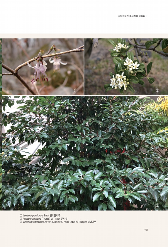 197 국립생태원 보유식물 목록집 Ⅰ ① ② ③ ① Lonicera praeflorens Batal 올괴불나무 ② Pittosporum tobira Thunb. W.T.Aiton 돈나무 ③ Viburnum odoratissimum var. awabuki K. Koch Zabel ex R?mpler아왜나무