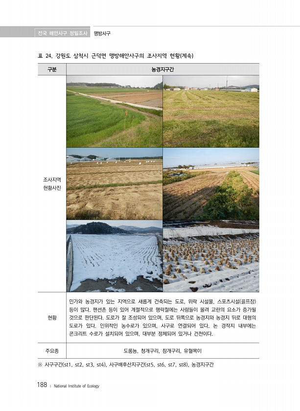 전국 해안사구 정밀조사 맹방사구 188 ? National Institute of Ecology 구분 농경지구간 조사지역 현황사진 현황 민가와 농경지가 있는 지역으로 새롭게 건축되는 도로, 위락 시설물, 스포츠시설 골프장 등이 많다. 팬션촌 등이 있어 계절적으로 행락철에는 사람들이 몰려 교란의 요소가 증가될 것으로 판단된다. 도로가 잘 조성되어 있으며, 도로 뒤쪽으로 농경지와 농경지 뒤로 대형의 도로가 있다. 인위적인 농수로가 있으며, 사구로 연결되어 있다. 논 경작지 내부에는 콘크리트 수로가 설치되어 있으며, 대부분 정체되어 있거나 건천이다. 주요종 도롱뇽, 청개구리, 참개구리, 유혈목이 표 24. 강원도 삼척시 근덕면 맹방해안사구의 조사지역 현황 계속 ※ 사구구간 st1, st2, st3, st4 , 사...